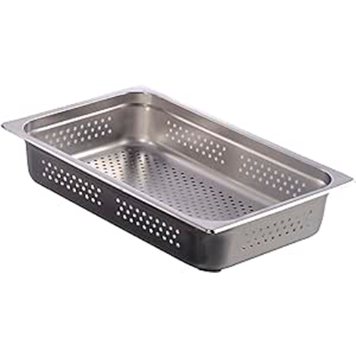 Inserto Perforado Entero: 53.5 x 33 cm con 4 pulgadas de profundidad. Diseño antiatascos para fácil apilamiento. Ideal para uso de baño maría o mesa fría. Inserto especializado para cocer al vapor o escurrir grasas, jugos o humedad.